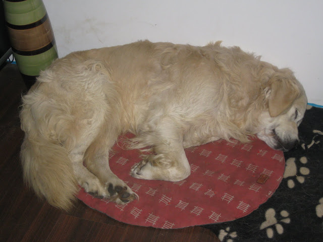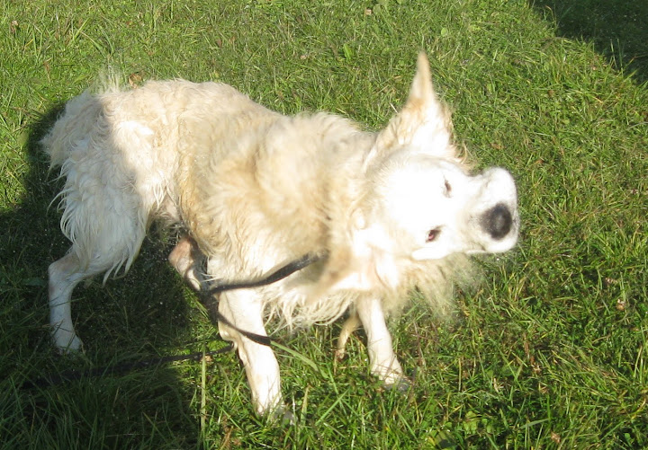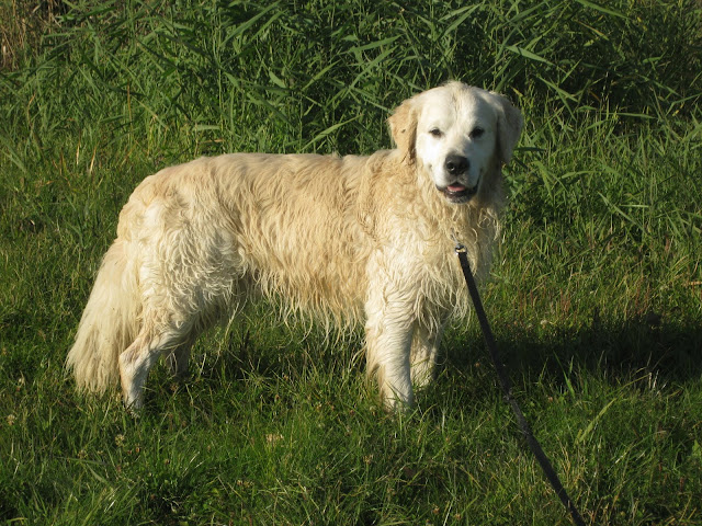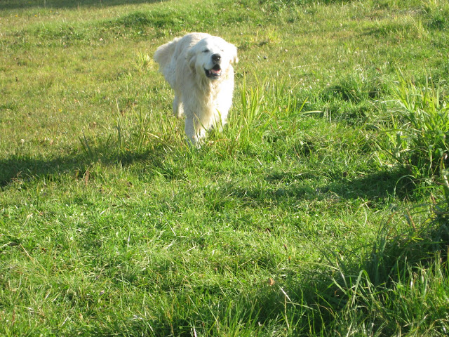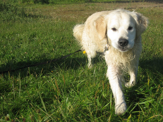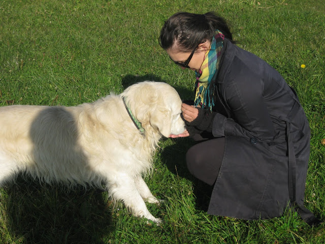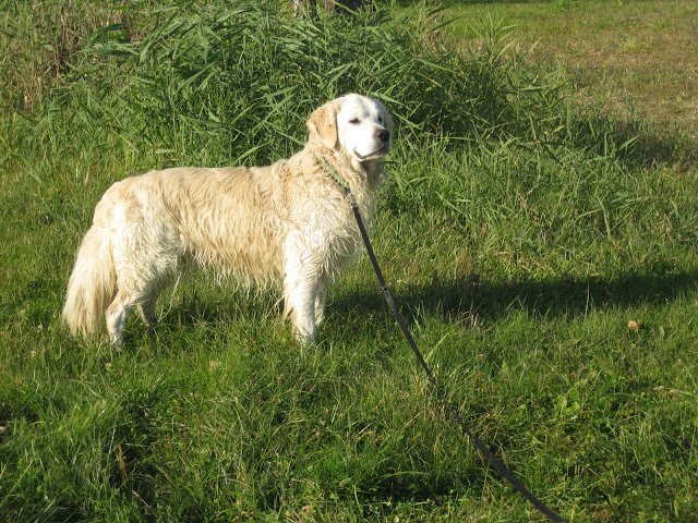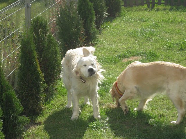 Na poranny spacerek zabrałam Tabę i Nugata na pola przy św, Wincentego. Nugat był na długiej lince. W niewielkiej odległościo zobaczył psa podbiegł do niego ale nie wykazał zainteresowania i wrócił do mnie na zawołanie. Potraktowała to jako dobry znak jednak po chwili dołączyły do nas para labradorów, golden i dwa setery. Wielkie podniecenie i ogólna radość u wszystkich psów jak to na tego typu spotkaniach, nie spodobały się Nugatowi. Ponownie zaczął warczeć i szczerzyć zęby na psiaki, które do niego podchodzi gdy on był w towarzystwie człowieka (i nie musiałam być to ja, również inni właściciele). Postraszył kilka razy labradorkę ale tylko na powarkowaniu siś zakończyło gdyż labradorka od razu poddawała się. Ciekawe jest, że Nugat niemal z minuty na minutę potrafi się zmienić z kochanego psiaka w bardzo pobudzonego psa, który dosłownie chce zaatakować każdego psa który się do niego zbliży (nawet Tabę z którą na codzień dogaduje się idealnie). I nawet podczas tego ataku agresji w stosunku do ludzi jest dalej przyjazny tzn np warczy i atakuje psa ale jeśli ktoś go zawoła podchodzi do czlowieka z merdającym ogonek podkładając się do głaskania.