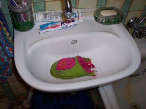 Ta częśc klapka była dokładnie w tym miejscu - padło podejrzenie na kota, że chciał uratowac chociaż częśc moich kapcioszków (bo umywalka jest "jej"):