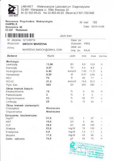 Kaja będzie miała sterylkę w środę rano (także prosimy trzymać mocno kciuki ) , jutro jedziemy rano na badania krwi.Edyta - 2010-10-04, 21:20 Ja też mieszkam na parterze ale mamy 7 stopni do pokonania (więc to chyba dobrze, bo będzie musiała się powoli z nimi oswajać, nie wiadomo gdzie mieszkają jej przyszli ludzie). Marzenko żel orozyme zamówiony, jaką karmę je Kajka?Aga Szanti - 2010-10-04, 21:24 Ja bardzo bardzo trzymam kciuki!