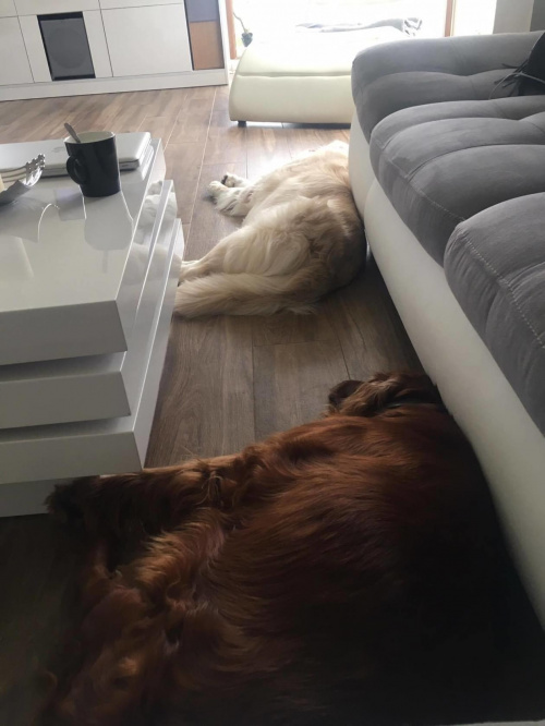 Ostatnio zostawilam dzieciaki w domu same na 3h z wlaczona kamerka w telefonie. Saszka automatycznie poszla spac, Ares krecil sie po domu popiskujac i wydajac z siebie dzwieki slonia nie slyszalam jeszcze czegos takiego. Cale szczescie uspokoil sie jak Saszka sie polozyla 'na widoku' i wiedzial ze nie jest sam.
