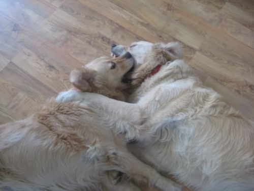 Generalnie to podobnie jak nasza Fredzia jest z niego taki "stary szczeniak"-obydwoje potrafią przez pół dnia się turlać po podłodze, bawić piłką,szmatką pluszakiem, kapciem....czymkolwiek. I z Fredą i z kotem Verdi dogaduje sie świetnie bywa że pozwala kotu wyżerać z miski ale i warknie na niego jak trzeba