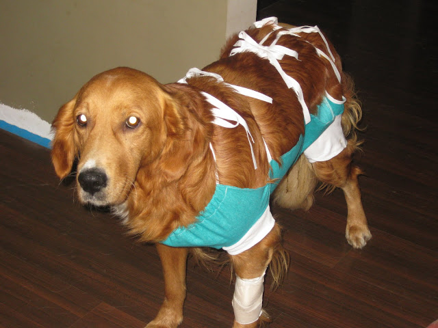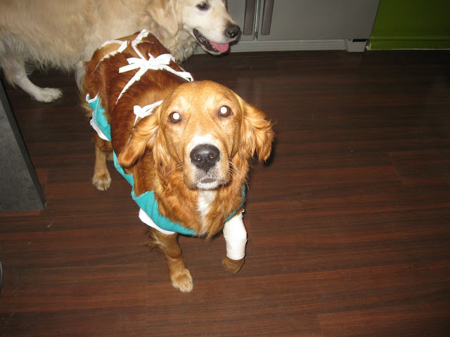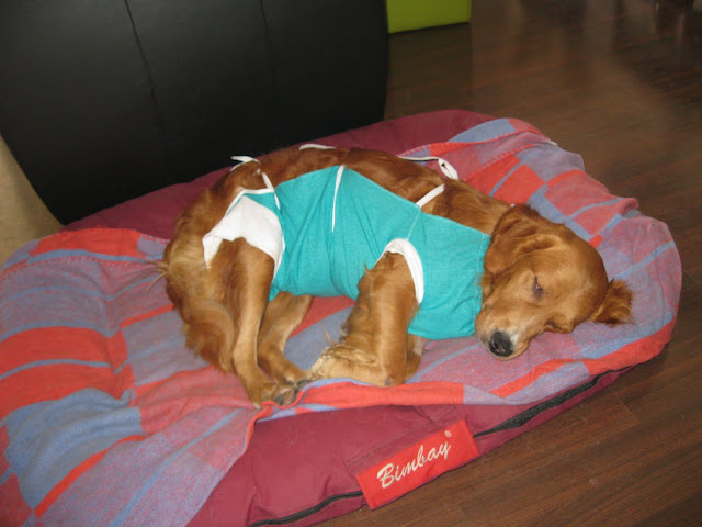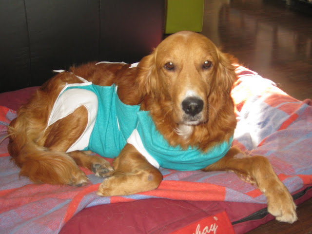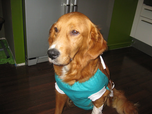 Dostałyśmy czopek z pyralginy, który dałyśmy suni już w domu i receptę na następne (mamy podawać co 8 godzin przez następne 3 dni.) Kupiłyśmy suni kubraczek, także z lizaniem rany nie powinniśmy mieć problemu(zobaczymy...). Kaja ma dalej weflon, który mamy wyciągnąć jutro (zostawiony został w razie gdyby coś było nie tak ...). Szwy należy ściagnąc za 10 dni