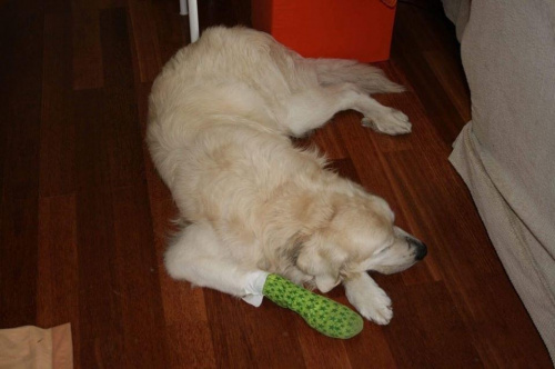 3. ma sporą ranę w miejscu, gdzie był guz na przedniej łapie, wylizywał to, wdarło sie zakażenie, jest tam ropa, zostało mu to zajodowane, ma duży opatrunek, dostał antybiotyk oraz lek przeciwbólowy i przeciwzapalny, ponoć mogło go to bardzo boleć (będziemy kolejne 4 dni chodzić codziennie na zastrzyk z antybiotyku + zmianę opatrunku)