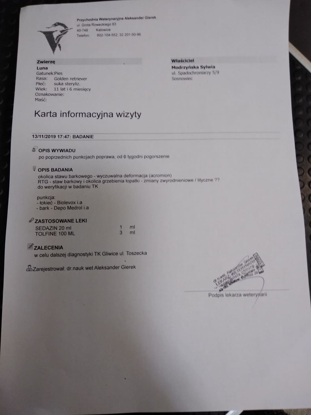 Lunką potrzebuje ogólnej konsultacji neurologicznej na którą skierował nas dr. Gierek z Katowic specjalista, ortopeda. Lunka obecnie największy problem ma z przednią łapką. Boli ją i utyka na nią. Wizyta u neurologa powinna odbyć się w Tychach. Pan doktor tak zaleca. Po konsultacji trzeba udać się na iniekcje kwasu hialuronowego.
