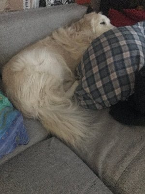 W ostatnim czasie u Aresa nasilił się lęk separacyjny. Jak zostaje sam w domu jest niespokojny, szczeka, kładzie się pod drzwiami… Pan Piotr zauważył, że w ostatnim czasie Arescoraz mocniej jest do niego przywiązany co może mieć związek z demencja i problemami ze wzrokiem (zaćma – prawdopodobnie widzi tylko kontury). Psiak zrobił się lękowy i każdy dźwięk na zewnątrz powoduje u niego duży niepokój ☹ Od kilku miesięcy Ares budzi się o 2,3 w nocy. Jest wówczas zaniepokojony – dyszy nerwowo upewniając się, że Pan Piotr jest w pobliżu. Domagają się również wyjścia na balkon i wędruje po domu. Opiekun przyznał, że bywa przez to niewyspany (ale nie narzeka !). W ostatnich dniach Ares zaczął dostawać olejek CBD i jest nieco lepiej.