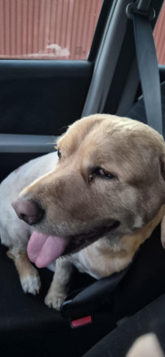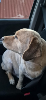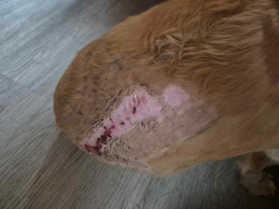 Psiak w maju został potrącony przez samochód w wyniku czego jego plecki zostały oskalpowane i musiał mieć amputowaną sporą część ogona.