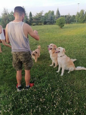 Jak na swój wiek, rok i 3 msc. Brunek jest psem bardzo spokojnym i stonowanymi, chyba że to jeszcze efekt stresu. Ma opanowane komendy skąd i daj łapę, nad innymi trzeba z nim pracować na razie bardzo się nas pilnuje i nie odstępuje na krok. Na mój głos nie chce reagować jeszcze, woli mężczyzn, ale jak to mi Ewa napisała, matka karmiąca i tak zawsze wygra