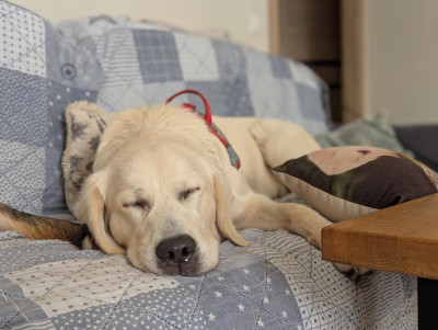 Golden jest ciekawy nowego miejsca i swobodnie eksploruje swój nowy dom. Nie okazuje silnych oznak stresu. Podchodzi do domowników i domaga się interakcji. Cieszy się nawet na męża Pani Izy, choć ogólnie bał się mężczyzn. Wieczorem był w stanie położyć się i odpoczywać.