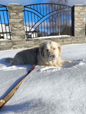 Golden poszedł ostatnio na spacer równoległy ze znajomym psem i był zachwycony. Dwa razy podczas wychodzenia opiekunów nie chciał zostać sam w domu i próbował na siłę przecisnąć się w drzwiach. Gdy w końcu udało się wyjść, piszczał ok 3 minuty i poszedł spać.