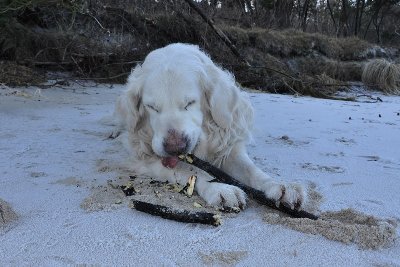 A poza tym to czuje się tutaj wyśmienicie. Chodzę na spacery, biegam, poznaję nowych fajnych Człowieków i okoliczne piesy - całkiem zresztą przyjazne - no i skaczę... A no właśnie bo o tym jeszcze Wam nie pisałem, kilka dni temu biegnąc po plaży nie zauważyłem takiego piaskowego uskoku jakby z wydmy czy coś no i poszybowałem niczym Małysz z dobre dwa metry w powietrzu. Maniek, to aż oczy łapkami zasłonił, Andrzej dostał histerii, a ja spokojnie wylądowałem, pozbierałem się do kupy i pobiegłem dalej. Tylko później przez cały dzień Andrzej mi dokuczał i pytał czy idziemy na skocznie poskakać? Żartowniś kurde, ja sobie mogłem łapeczki moje biedne połamać a ON jaja sobie robił. W końcu do cholery mam jedno oczko kaprawe to mogę czasem czegoś nie zauważyć - no nie?