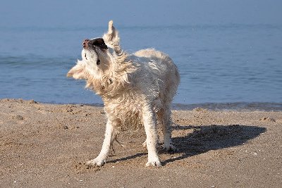 W poniedziałek popołudniu wykorzystałem chwilę nieuwagi Andrzeja i wskoczyłem do morza. No przecież być to nie może, żeby być nad morzem i kąpieli nie zażyć - prawda? No ale oczywiście przesadziłem, bo chwile po wyjściu z wody dostałem lekkiego ataku trzęsawki. Wywaliłem się na piach i troszkę łapka moja tylna się pokiwała. W sumie to nic wielkiego się nie stało, ale Andrzej był bardzo zły. Wszystko trwało krótką chwilkę i bardzo szybko wróciłem do normy. No w każdym razie mam zakaz kąpielizowania