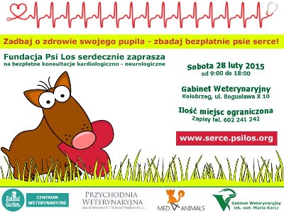 Ten Andrzej to ma słuchajcie głowę na karku. Wymyślił sobie, że zorganizujemy wielka akcję badania psich serduszek w Kołobrzegu. Oczywiście wszystko za darmo będzie. Przy okazji aż z Gdańska przyjedzie bardzo dobry pan doktor kardiolog ze swoim kolegą neurologiem. No i znowu wychodzi na to, że badać mnie będą. Ale powiem Wam, że bardzo się cieszę z tej akcji bo wiem, że nie wszystkie człowieki mają pieniążki żeby za takie drogie badania zapłacić - a wiadomo, że serducha psiakom od czasu do czasu sprawdzić należy. Jeśli więc jakiś "Warciak" z Kołobrzegu lub okolic chciałby się załapać na badanie kardiologiczno neurologiczne to już teraz zapraszam. Wszystko odbędzie się w sobotę 28 lutego. Jak będę wiedział gdzie, co i jak to od razu Wam napiszę.