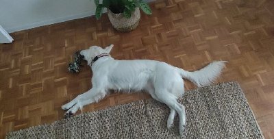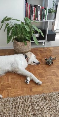 W domu nie jest mocno absorbująca i przy trzech spacerach dziennie (w tym dwóch dłuższych) potrafi przespać zdecydowaną większość dnia. Pod naszą nieobecność zdarza jej się skubnąć i zniszczyć przedmioty w jej zasięgu, więc polubiliśmy się z minimalizmem. Po analizie nagrań z kamery wyszło, że "godzina zero" ma miejsce około 12-13, kiedy panna się przebudza i spaceruje po mieszkaniu w poszukiwaniu ofiary. Oszukujemy ją trochę, specjalnie zostawiając jej w kuchni jakąś ścierkę do poszarpania. Pomaga też wydzielanie zabawek, patyki z drzewa kawowego, czy róg jelenia. Przy powitaniach z nami mocno się ekscytuje (w domu biega z sypialni do salonu, wskakuje na łóżka po czym od razu kładzie się na plecach i „głaszcz mnie”; na dworze często zdarza jej się na nas skakać) i tutaj jeszcze dużo pracy prze nami. W domu dobrze sprawdza się przekierowanie na zabawkę, a na podwórku komenda „siad”. Kiedy trzyma już coś w pysku albo skupia się na wykonaniu zadania łatwiej radzi sobie z emocjami.