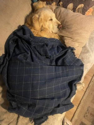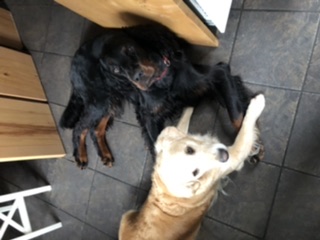 Dzisiaj od rana pełna mobilizacja. Zorganizowana grupa osaczyła przedsionek kuchenny. Plan mają taki: Misha robi minkę wygłodniałego Goldenka a Bruno robi ukłony prosząc błagalnie. Tych dwoje tworzą zestaw idealny. Misha dostaje nawet buziaki w nochal i merda wtedy wesoło ogonkiem. Dzięki Mishce Brunko też polubił wycieranie łapek.
