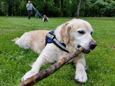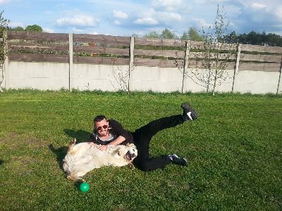 Prócz tego zakończyliśmy szkolenie - dzięki niemu Jammal wzorowo wykonuje podstawowe komendy (siad, waruj, łapa, zostań), dużo lepiej chodzi na smyczy (właściwie już nie ciągnie) i łatwiej skupia na nas uwagę.