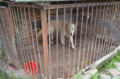 Pies w stanie znacznego wychudzenia, weterynarza nie widział od lat, zapchlony, skołtuniony, z wrzodem rogówki oka, bez dostępu do wody, rzucający się na podane jedzenie.