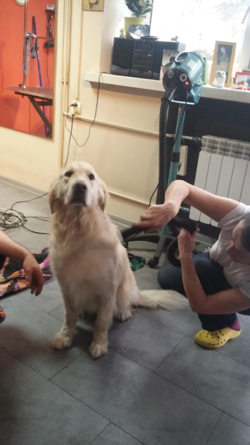 Bardzo grzecznie zachowywał się podczas zabiegów, zdziwiony chyba, że ktoś się nim zajmuje... Chyba nawet miałam wrażenie,że rozkoszował się prysznicem. Suszeniem był zaskoczony ale tylko na początku. Teraz widać dopiero jaki to piękny pies.