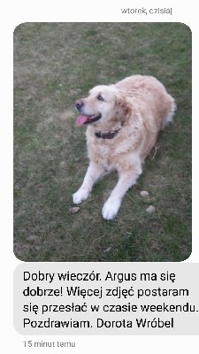 Opiekunka Argusa wysłała dziś do mnie smsa o treści, że psiak ma się dobrze i wszystko u niego w porządku.