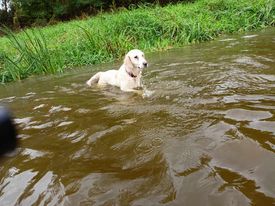 Ubóstwia wodę odkąd się przekonała, że rzeczka wcale nie gryzie. Biega, pływa i szaleje. Nie odpuści też kałuży i mniejszym sadzawką. W rzece potrafiła obszczekać kajaki ale już w zasadzie traktuje kajak jako tło rzeki.
