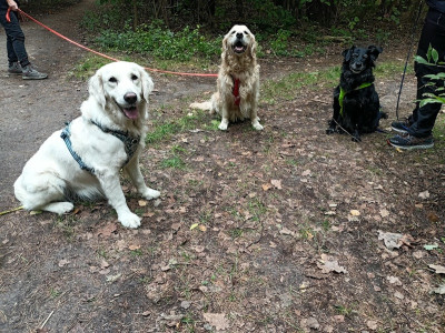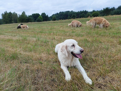 Podąża chętnie za dziewczynami, potrafi się z nimi mocno oddalić ale zaraz wraca i się odmeldowuje. Wie też, że żeby wymusić smaczka należy usiąść i nie trzeba się wpychać przed innych bo i tak dostanie.
