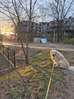 Z takich ciut gorszych wiadomości, to właśnie na tej działce Max rozciął sobie opuszkę na łapie i to dość porządnie.. mimo niezwłocznej wizyty u weterynarza i operacji zszycia, rana nie chciała się zrosnąć i po 2 tygodniach lekarz podjął decyzję o ponownym zszyciu opuszki. Tak więc Max miał przymusowe ograniczenie ruchu przez prawie dwa miesiące dla takiego chłopaka to tragedia, nie mógł biegać po dworze więc energia roznosiła go w domu - staramy się to teraz nadrabiać i zabieramy go na wybieganie i łapanie tropów do lasu oraz zawieramy nowe znajomości wśród innych goldenów - również załączam fotkę.