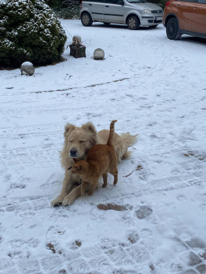spóźnione wieści, ale dobre ;) Sprite robi postępy na spacerach, spaceruje na smyczy, jak się boi trzeba chwilę poczekać, ale jak zauważy, że jest ok, to rusza dalej. Jak widać na zdjęciu ma przyjaciela rudzielca ;) O zdjęcie Sprite trudno z uwagi na jego ruchliwość, ale coś się udało ;)