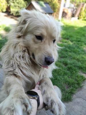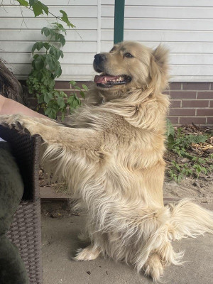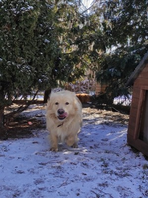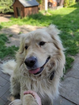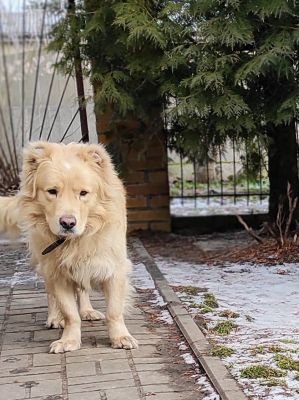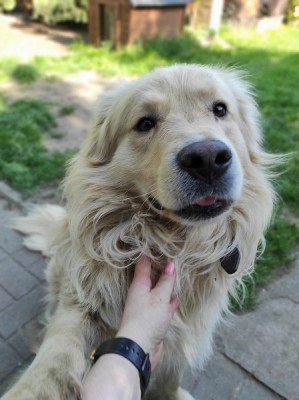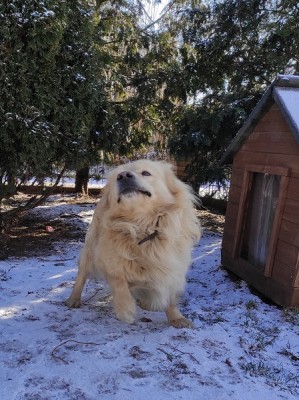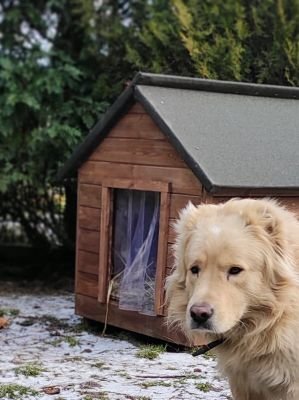 Czasem wchodzi do domu np. po smaczki gdy wrócimy z pracy. Ma dobry apetyt. Nie przejawia cienia agresji. Dalej preferuje suchą karmę wymieszaną z mokrą. Dostaje puszki od Was mieszane z doliną noteci. Nadal nie wychodzi poza furtkę nawet gdy ta jest otwarta. Cieszy się gdy jesteśmy na podwórku. Śpi niestety dalej najczęściej w wykopanej norze. Budę omija szerokim łukiem i nadal do nie nie wszedł. Jedynym powodem by przenocował w domu są wystrzały np. petard . Jest wtedy niespokojny, podenerwowany. Kręci się. Wchodzi na człowieka do łóżka. Jest wtedy problem aby wyszedł się załatwić. Ogólnie jest zdrowy. jest zaszczepiony tylko na wściekliznę. Z racji gabarytów i strachu do chwili obecnej nie udało się dowieźć go do weterynarza.
