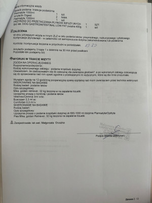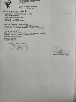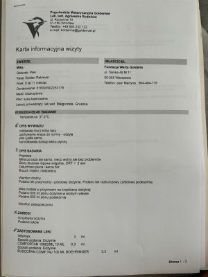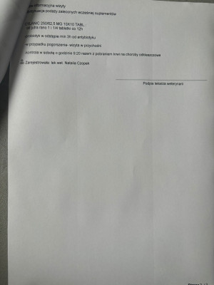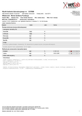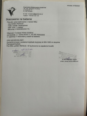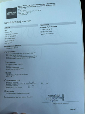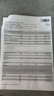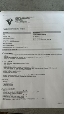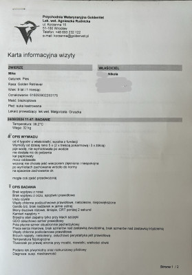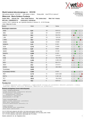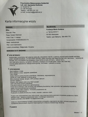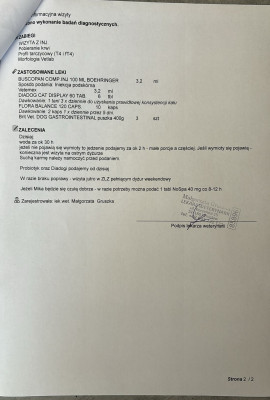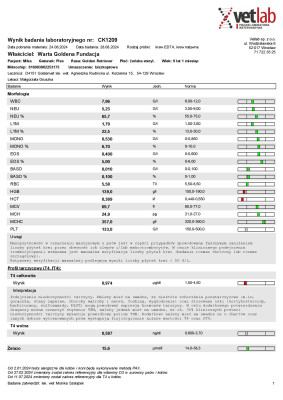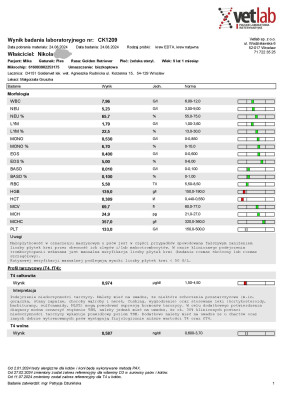Z racji że była to pierwsza wizyta Miki w tej klinice, Nikola poprosiła o ponowny "przegląd", a korzystając z okazji wykonane zostały kontrolne badania krwi z profilem tarczycowym. Na samym dole postu wklejam opis wizyty wraz z rozpiską leków które zostały przepisane. Finalnie nie wiemy czym i czy w ogóle poczęstowała się na spacerze Mika, ale leki i specjalna karma pomogły i Mika czuje się już dużo lepiej.