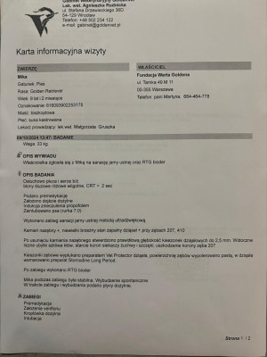 USG wykazało około centymetrową zmianę na śledzionie, do kontroli za 3 tygodnie razem z rozszerzoną morfologią. Ciężko mi napisać coś więcej, ponieważ nie dostaliśmy jeszcze opisu od weterynarza po badaniu USG.