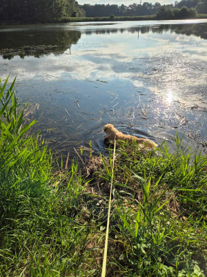 Oprócz tego Mika czuje się świetnie, jest bardzo przyjazną i radosną suczką, uwielbia kontakt z człowiekiem. Nasza podopieczna miała okazję popływać ostatnio w jeziorze - oczywiście bardzo jej się podobało.