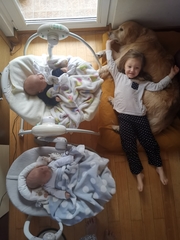 W jego i w naszym życiu pojawiła się jeszcze jedna mała osóbka. Na początku 4 teraz już 2 nożna. Mianowicie nasza córka Marysia. Obydwoje jakoś sobie radzą z wzajemną obecnością. Można powiedzieć, że nawet o siebie dbają. Marley dba, żeby Marysia się nie przejadała, kradnąc jej z rączek wszystko co nadaje się do jedzenia. Marysia dba, żeby Marley miał zabawy pod dostatkiem, ganiając go po domu z jego zabawkami. Czasami chłop sobie leży, a ona próbuje mu wcisnąć węzełek do pyszczka. Mina kawalera bezcenna - a weźcie ją ode mnie :)