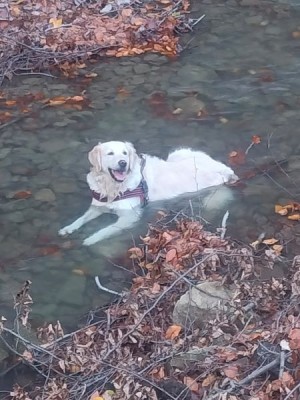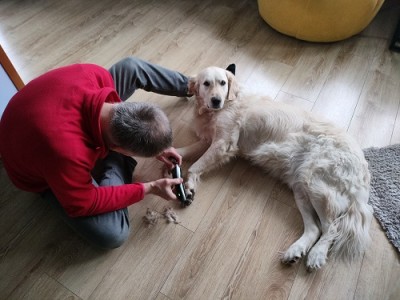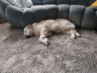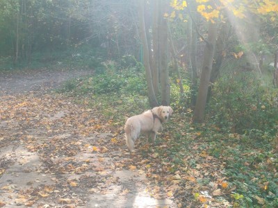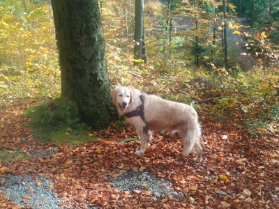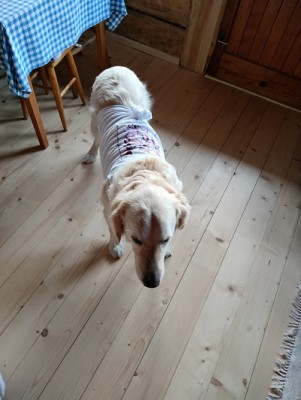 Spacery mamy niestety krótkie a dłuższe z odpoczynkami bo jednak skakanie męczy. Garret jak na goldena to jest duży, waży aktualnie 39 kg, zawsze był „wysportowany", umięśniony, taki „byczek" więc pod względem wydolnościowym nie ma problemu, nawet musimy go stopować żeby nie przeciążył pozostałej tylnej łapy bo wtedy byłby kłopot. Na dłuższe spacery przydałby się nam wózek, żeby mógł normalnie iść lub biec a nie podskakiwać...