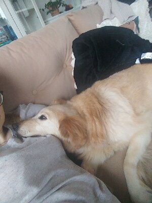 Reaguje na komendę "siad" i pozwala się uspokoić, gdy ktoś puka do drzwi. Mamy też coraz większą liczbę osób, które mogą wejść - z pewnością największa akceptacja występuje w przypadku kobiet i dzieci, a chyba nawet większa przy dziewczynkach - wczoraj w domu mieliśmy 3 kobietki - w tym dwie małe - i tak wykończył się Obi zabawą, że przespał, chrapiąc, kolejne 3 godziny po ich wyjściu. A potem z radością pobiegł na spacer.