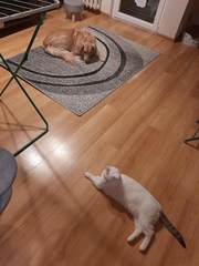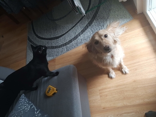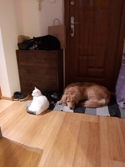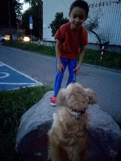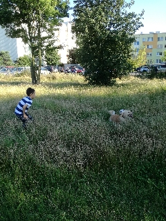 Viper- Vigo jest u nas już dwa miesiące. Wszystko układa się dobrze. Nadal jest dość spięty w nowych dla niego sytuacjach. Nie płacze już tak strasznie kiedy zostaje sam. Najlepiej układają się relacje pies - dziecko, bawią się razem, biegają, od niedawna aportuje. Od czwartku przez trzy tygodnie tymczasuje u nas kotka. Vigo już kiedyś spotkał się z kotem twarzą w twarz, miałam wrażenie, że albo nie widział nigdy wcześniej kota albo się boi. Teraz nie ma jakichś szczególnych spięć. Koteczka nauczyła go, że jak się kroi mięsko to trzeba grzecznie siedzieć, coś spadnie.