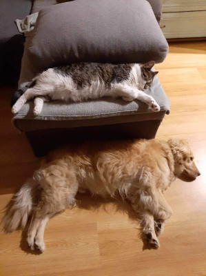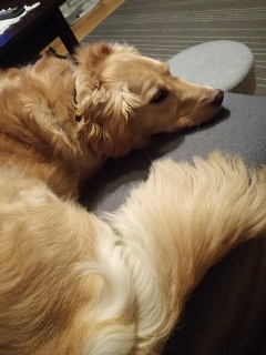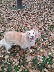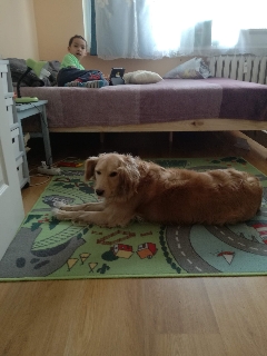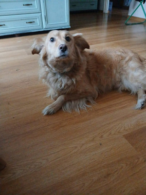 Viper-Vigo jest u nas od 18 sierpnia 2016. Został zgłoszony do Warty jako błąkający się od jakiegoś czasu golden. Pojechałam po niego, gdzieś na wieś pod Radomiem. Był u nas w DT, jednak tak doskonale wkomponował się w naszą rodzinkę, że postanowiliśmy go adoptować. Vigo nie jest goldenem, jest mniejszy ok 20 kg. Jest zwykłym pieskiem w kolorze goldena. Przez pierwsze trzy miesiące strasznie płakał kiedy zostawał sam w domu, o czym uprzejmie donosili sąsiedzi. Z czasem przyzwyczaił się do tego, że wracamy i grzecznie czeka. Całkiem niedawno będąc u mojej mamy, został na chwilę sam w domu, strasznie płakał. Jest bardzo delikatnym pieskiem, nadal reaguje strachem na głośne dźwięki, nawet na te, które zna dochodzące z budowy na przeciwko naszego domu. Nie wykazuje żadnej agresji