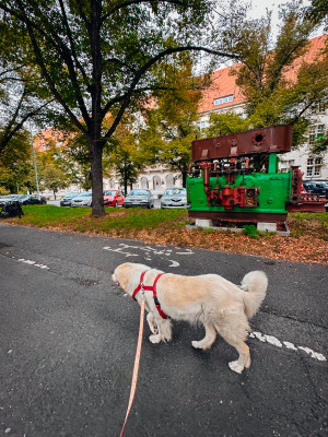Trochę bała się tramwajów, widać też było że większa ilość samochodów obok niej również sprawia dyskomfort. Była jednak bardzo dzielna i maszerowała dalej, oraz niekiedy niuchała dość długo!