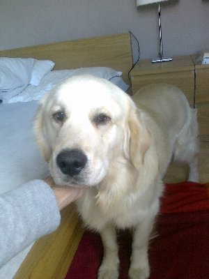 Jestem po wizycie u Miśka i Pawła. Misiek jest wielkim puchaczem, ma futro, jak żaden dotąd poznany przez mnei Golden - po prostu gęste futro Miśka. Rzeczywiście jest bardzo przerażony, ale widać, że z każdym momentem robi postępy.