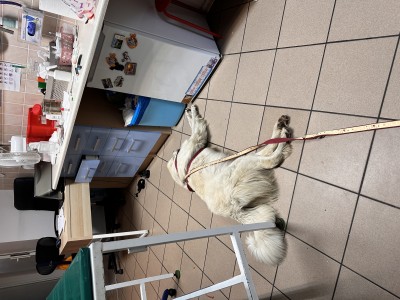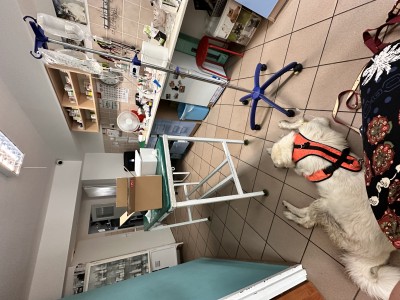 Badanie Lola przeszła bez problemu pod względem podejścia - lecz samo badanie, sprawdzanie łap, odruchów, niestety nie dało aż tak pozytywnych rezultatów - mała piszczała prawie za każdym razem, kiedy pani doktor ją mocniej dotknęła lub tak ruszała kończynami, by sprawdzić ich ruchomość - również pisk i ból… stąd zapewne są nasze tak wolne spacery mimo podawania Cimalgexu oraz preparatu na stawy dla koni.
