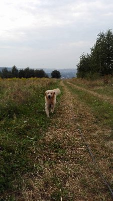 Koło południa był na pierwszym poważniejszym dwugodzinnym spacerze Niestety ciągnie na smyczy, ale jest to do opanowania i wyszkolenia. Kontakty z innymi psiakami odbywały sie przez siatki (inne psy na swoich posesjach ). Niestety cieżko było go zainteresować czymś innym. Psiaki szczekały i on tez nam sie wyrywał.