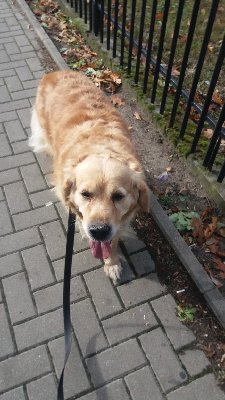 Chodzi ładnie przy nodze, nie ciągnie smyczy (chyba, że dojrzy Kajetana w oddali. wtedy nie ma przebacz. trzeba się mocno zaprzeć, bo inaczej można obejrzec chodnik z bliska)