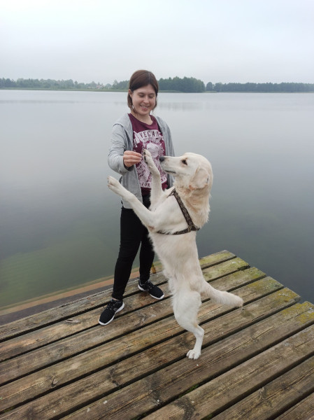 Na spacerach jest grzeczny, chociaż ma tendencję do plątania się pod nogami i ciągnie do innych psów - trochę mniej skacze, ale to jeszcze długa droga.