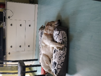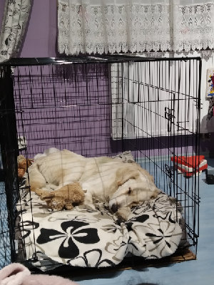Największym wyzwaniem jest nauka zostawania samemu, od piątku uczymy Larego korzystać z klatki kennelowej - wchodzi do niej bez problemu, noc przesypia też głównie w (otwartej) klatce, w dzień też potrafi się tam ulokować. Będziemy go uczyć zostawania w zamkniętej klatce. Klatka może nauczy go odpoczywać, bo rzadko zdarza się, żeby udało mi się wyjść do innego pokoju bez jego asysty.