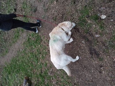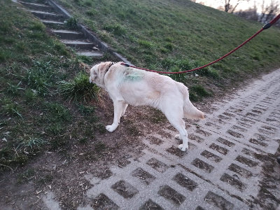 Bardzo ładnie zachowuje się na spacerach - ciągnie do innych psów i czasem plącze się na smyczy, ale przeważnie nie szarpie, coraz mniej skacze. Ma już dużo pisch kolegów i koleżanek, bardzo upodobał sobie oczywiście goldeny :-D choć nie każdy właściciel rozpoznaje w nim samym goldena :->