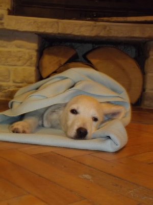 Już całkowicie pokochała się z naszą stara suką, bawi się z nią ciągle a wieczorem kiedy pora na sen bierze w zęby swój kocyk i gramoli się z nim do starej suki na posłanie po czym razem śpią.