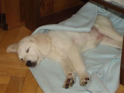 Jutro idziemy na drugie szczepienie i wizytę kontrolną, w tygodniu też byliśmy u weterynarza – bo odnowiło się zapalenie spojówek w lewym oku i w ogóle pies był osowiały. Okazało się, że to nic groźnego – po prostu hurtowo jej się wymieniają zęby i stąd ogólne obniżenie odporności. Po kilkunastu godzinach wszystko jej przeszło i w ramach rekonwalestencji „zjadła” nogę od stołka. Poza tym psiak jest w 100% zaaklimatyzowany, bawi się, dokazuje, rośnie jak na drożdżach, już w pełni zna swoje imię i zaczyna prosić o spacery. Próbuje tez przejąć kontrolę nad staruszką suką i nawet czasami jej się to udaje, gdyż w starszej koleżance chyba się obudziły instynkty macierzyńskie i pozwala Zunie spać na sobie, wyprowadza ja na spacer i nawet daje jeść ze swojej miski.