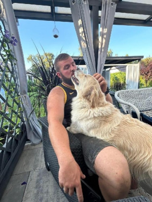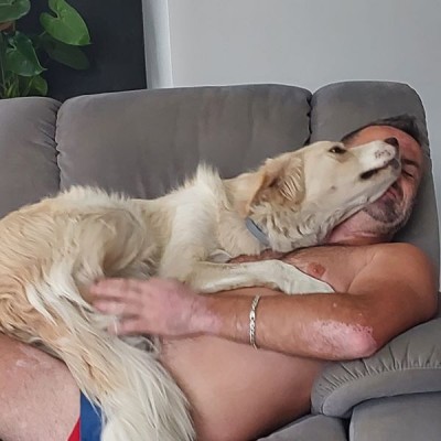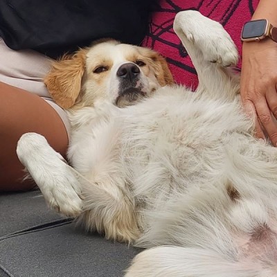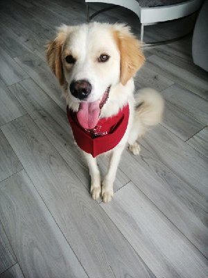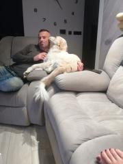 Jest to przekochany pies, słucha się bardziej niż Stacy na zawołanie bezbłędnie, trochę jeszcze szczęka na ludzi za ogrodzeniem ale pracujemy nad tym. Z kotem żyje w zgodzie tylko w domu, jak tylko wyjdą na dwór to ją goni🤦🏼‍♀ostatnio zauważyłam że jak położy się na moje nogi i nimi ruszę to warczy i ucieka, dziwne bo nigdy tak nie robił, może był kopany nie wiem…"