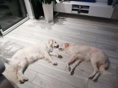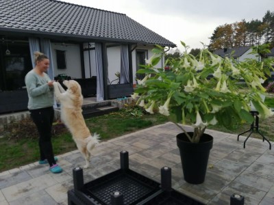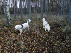 Broni domu jak nikt inny, więc szczekanie za płotem chyba już u nas zostanie do końca :-D karmimy psiaki brittem a wcześniej dostawały salmona, z nogami doszliśmy do wniosku że musiał być kopany więc My jesteśmy bardzo uczuleni żeby nie robić mu przykrości takimi zachowaniami, ze Stacy najbardziej dogadują się na spacerze jak walczą o ten sam zapach :) ) oba nasze psiaki są z nami i "pomagają" w każdych pracach domowych i ogrodowych ;)