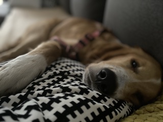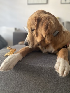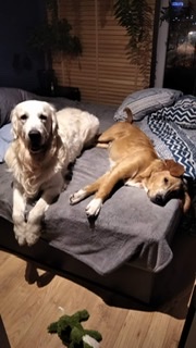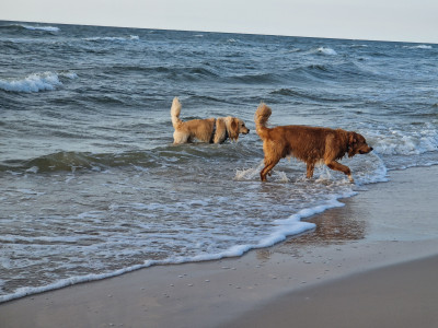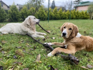 Dużo czasu spędzamy z moją siostrą i jej goldenem Kokosem który niczym mentor pokazuje Rio dobre i te gorsze goldenowe zachowania (zaczął od lekcji kopania) 😉. Aby upewnić się że zabawa między nimi jest zdrowa ( Rio sporo powarkuje w trakcie) skorzystaliśmy z konsultacji z behawiorystą. Ocenił on, że wszystko jest w porządku – pies ma dobrą energię- tylko zabawa jest mocno aktywna i doradził aby nie potłowały się w domu.