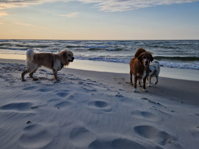 Na spacerach jest bardzo zainteresowany wszystkim co się rusza I entuzjastycznie podchodzi do innych psów, dzieci I ludzi.