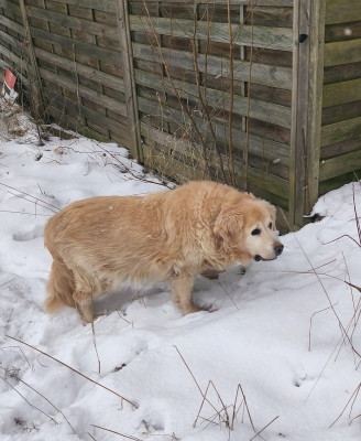 Bejbi znaczy Miłka miała dziś sesję zdjęciową. Jej stan ruchowy poprawił się na tyle że szła w śniegu jak czołg, dwa razy tylko dupka opadła ale wstała sama. Ambitna dumna dama. I nie śmiejcie się bo po ponad miesiącu siusiania i kupania od 2 tygodni znów zaczynamy wracać do formy. Co dzień kilka metrów dalej. Czasem się drę ale Bejbi pamiętaj trzeba WROCIC!!!! 15 lat a niunia ambitna jak mój stary z kolejnymi regatami Vendee Globe. Zakochałam się w goldenach. I naprawdę marzy mi się totalnie niestabilny pies z tej rasy. Marzy mi się zjadanie kapci, walka przy kuchence.